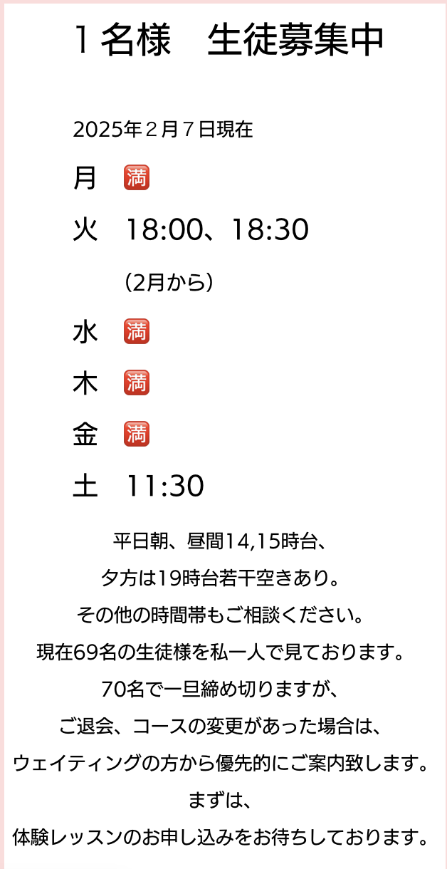 ご希望のお日にちがない場合は、直接お問い合わせください。 体験レッスンのみ、日曜祝日も受け付ける場合がございます。マタニティ期からシニアまで、発達がゆっくりなお子さまからコンクールを目指す生徒さんまで、