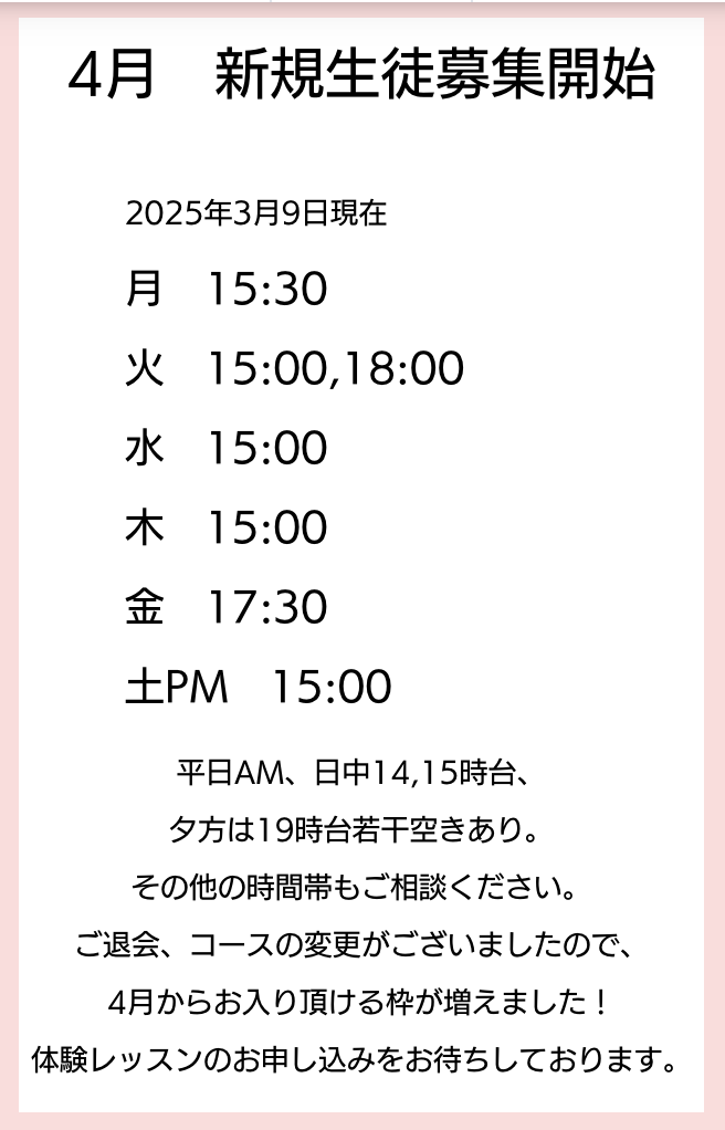 ご希望のお日にちがない場合は、直接お問い合わせください。 体験レッスンのみ、日曜祝日も受け付ける場合がございます。マタニティ期からシニアまで、発達がゆっくりなお子さまからコンクールを目指す生徒さんまで、
